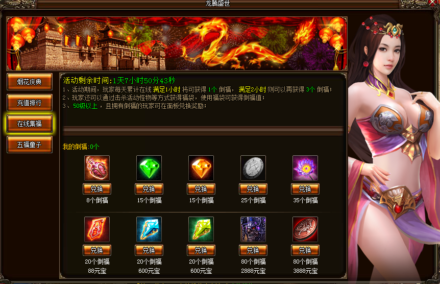 活动详情:活动期间,玩家每天在线1小时可获得1个倒福,再在线2小时可获得3个倒福;拥有倒福的玩家可在活动面板中兑换指定奖励;还可通过击杀活动怪物的方式获得福袋,使用福袋可增加倒福值;活动结束后,未兑换的倒福值将清空,请及时使用。