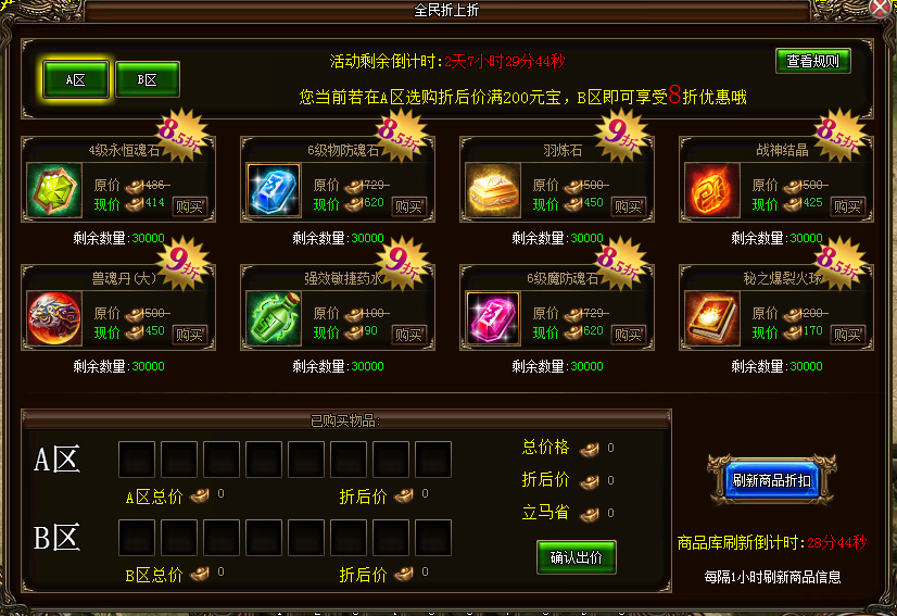 活动详情:活动期间,全民折上折A区商品折扣放送,并可刷新折扣率,最低可刷出2折,B区商品原价出售。当A、B区商品一起购买时,若在A区选购折后价达到指定数额元宝,则B区物品可享受额外打折优惠。