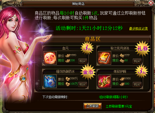 活动详情:神秘商店商品区物品分礼券、金币、元宝购买,每2小时自动刷新1次,玩家可通过立即刷新按钮进行刷新,每次刷新可购买1件物品。