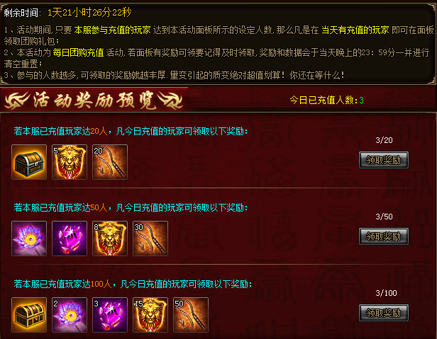活动期间,只要每天本服参与充值的玩家数量达到活动面板设定的人数,当天有充值的玩家即可在面板领取对应的团购礼包,礼包每天只可领取一次,团购礼包每天23:59进行清空重置,不进行补发,需玩家及时领取。
