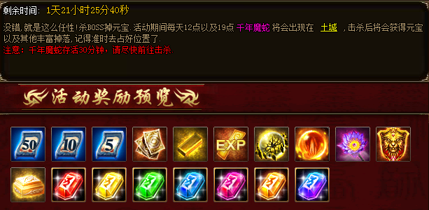 活动期间每天12点及19点会在土城刷出BOSS千年魔蛇,击杀后会掉落元宝票及其他珍贵道具。
