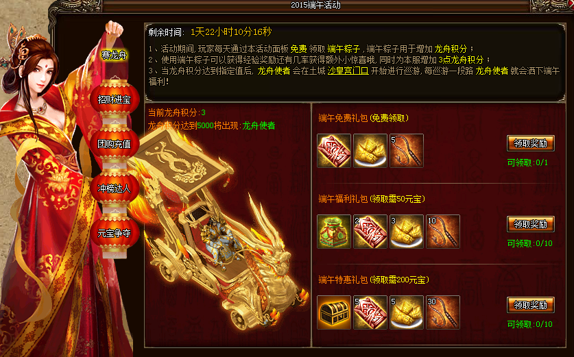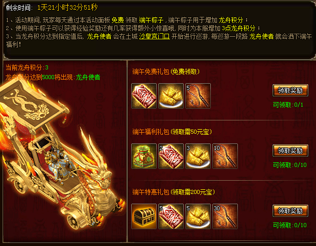 a) 活动期间,玩家每天通过活动面板领取礼包获得端午粽子,使用端午粽子可以获得大量经验并有几率获得道具奖励,每使用一个端午粽子增加本服3点龙舟积分