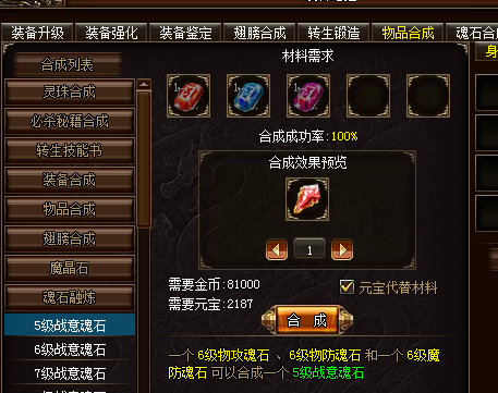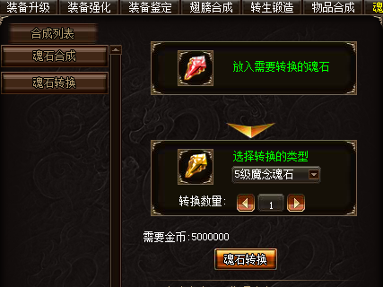 2) 三种魂石可以通过物品合成里的魂石熔炼合成获得,合成规则:消耗同等级的物攻/魔攻/道攻魂石、物防魂石、魔防魂石及金币合成一个低一等级的战意/魔念/道心魂石,熔炼材料可以使用元宝代替,最低可熔炼获得5级魂石;