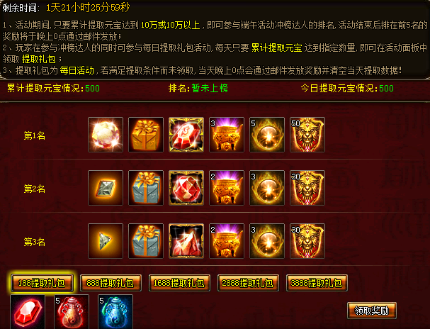 b) 活动期间,玩家每天累计提取元宝达到188、888、1688、2888、3888即可在面板领取相应的每日充值礼包,礼包每日重置,当天没有领取的奖励第二天零点时以邮件补发。