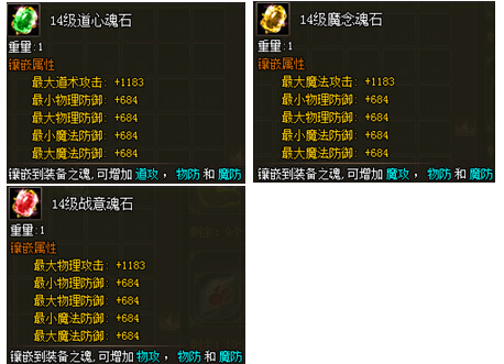 1) 战意魂石增加物理攻击、最小最大物防、最小最大魔防,魔念魂石增加魔法攻击、最小最大物防、最小最大魔防,道心魂石增加道术攻击、最小最大物防、最小最大魔防;