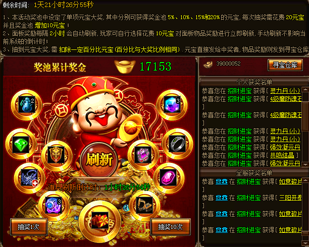 d) 抽奖获得的物品道具直接发放到玩家的寻宝仓库,元宝大奖直接发放给中奖者