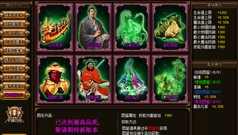 今古异志新增套卡端阳旭日卡,卡牌通过开启图鉴旭日包获得,图鉴旭日包可通过参加端午活动等运营活动获得。