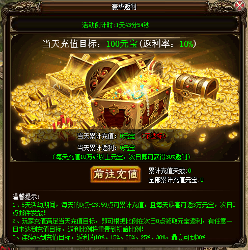 活动详情:活动期间,每天0:00-23:59可累计充值,且每天最高可返3万元宝,次日0点邮件发放。玩家充值满足当天充值目标,即可根据比例在次日0点领取元宝返利,有任意一日未达到充值目标,返利比例将重置到初始比例。连续达到充值目标,返利为10%、15%、20%、25%、30%,最高可到30%。