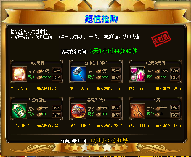 活动详情:活动开启后,抢购区商品每隔一段时间刷新一次,玩家可通过超低的价格抢购各种稀有道具,限量发售,物超所值,欲购从速!
