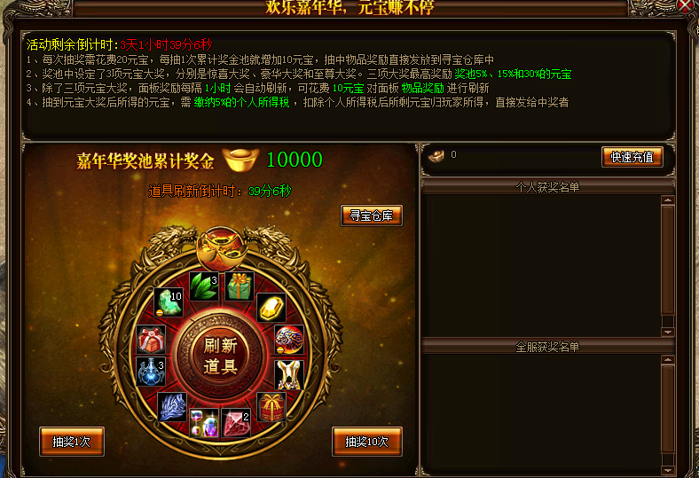 2、转盘面板奖励每隔1小时自动刷新,可花费10元宝对面板奖励快速进行刷新。