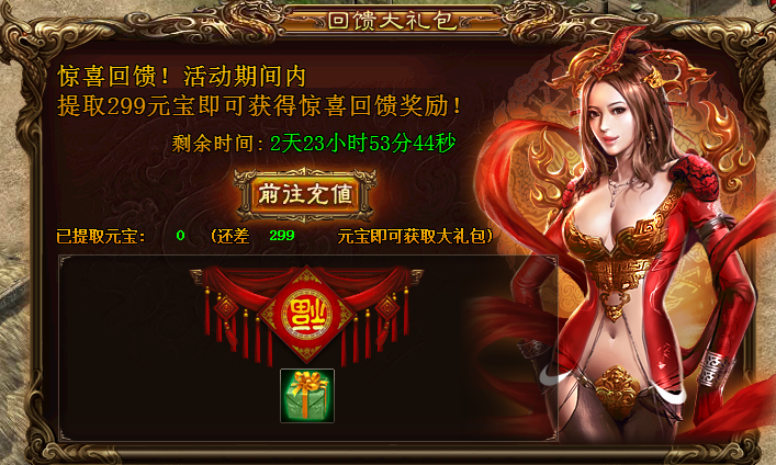 史上最实惠的充值大回馈,仅需提取299元宝即可获惊喜大礼,还等什么呢?