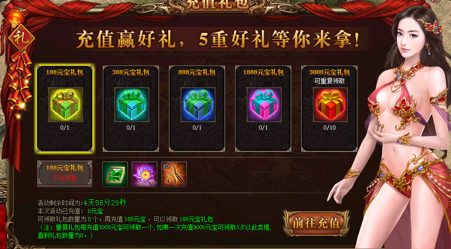 活动详情:活动期间充值达到指定元宝数,即可领取一份对应充值礼包,3000元宝礼包更可重复充值领取10次,每充值3000元宝可领取一个,直到礼包数为0为止。