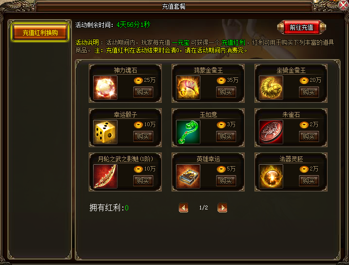 活动详情:活动期间,玩家每充值一元宝可获得一个充值红利,红利可用于购买活动中的丰富道具商品。注意:充值红利在活动结束后清零,请在活动期间内消费完哦。