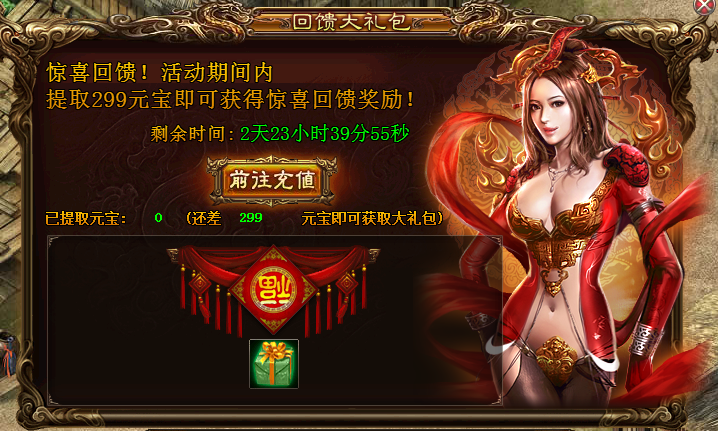 史上最实惠的充值大回馈,仅需提取299元宝即可获惊喜大礼,还等什么呢?