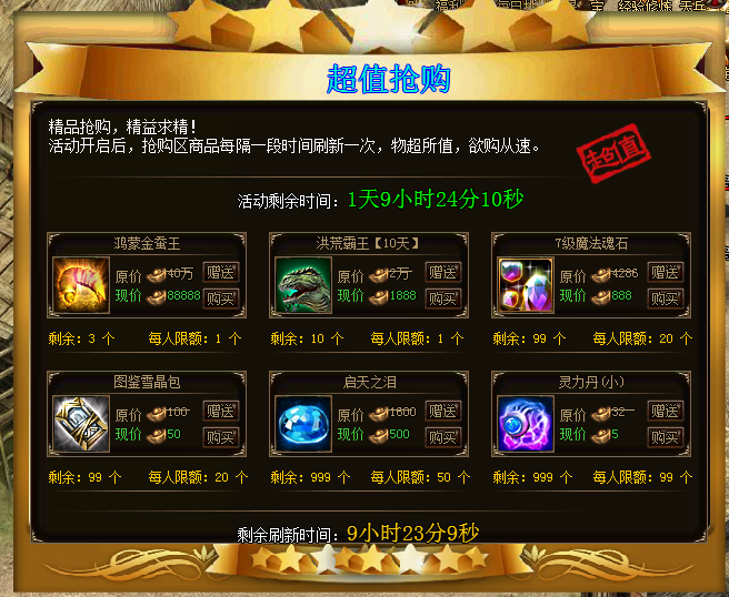 活动详情:活动开启后,抢购区商品每隔一段时间刷新一次,玩家可通过超低的价格抢购各种稀有道具,限量发售,物超所值,欲购从速!