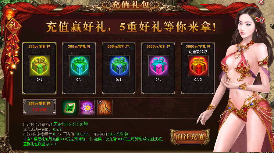 活动详情:活动期间充值达到指定元宝数,即可领取一份对应充值礼包,3000元宝礼包更可重复充值领取10次,每充值3000元宝可领取一个,直到礼包数为0为止。