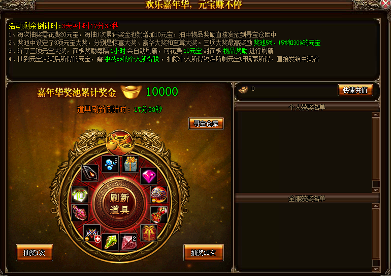 2、转盘面板奖励每隔1小时自动刷新,可花费10元宝对面板奖励快速进行刷新。