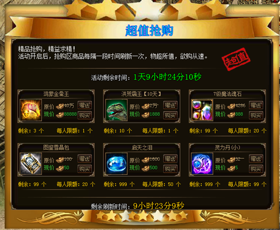 活动详情:活动开启后,抢购区商品每隔一段时间刷新一次,玩家可通过超低的价格抢购各种稀有道具,限量发售,物超所值,欲购从速!