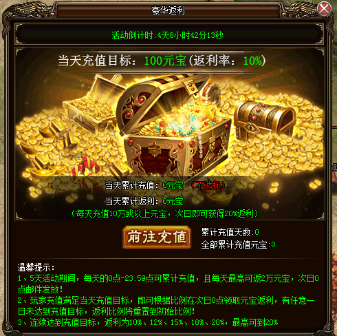 活动详情:活动期间,每天0:00-23:59可累计充值,且每天最高可返2万元宝,次日0点邮件发放。玩家充值满足当天充值目标,即可根据比例在次日0点领取元宝返利,有任意一日未达到充值目标,返利比例将重置到初始比例。连续达到充值目标,返利为10%、12%、15%、18%、20%,最高可到20%。