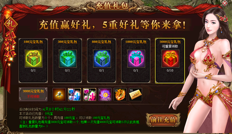 活动详情:活动期间充值达到指定元宝数,即可领取一份对应充值礼包,3000元宝礼包更可重复充值领取10次,每充值3000元宝可领取一个,直到礼包数为0为止。