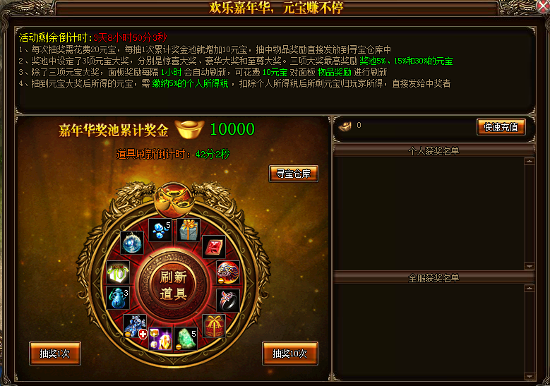 2、转盘面板奖励每隔1小时自动刷新,可花费10元宝对面板奖励快速进行刷新。
