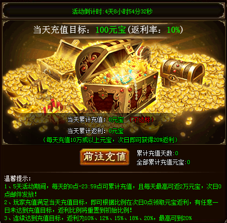 活动详情:活动期间,每天0:00-23:59可累计充值,且每天最高可返2万元宝,次日0点邮件发放。玩家充值满足当天充值目标,即可根据比例在次日0点领取元宝返利,有任意一日未达到充值目标,返利比例将重置到初始比例。连续达到充值目标,返利为10%、12%、15%、18%、20%,最高可到20%。