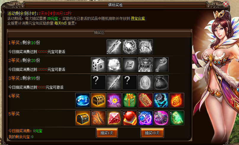 活动详情:活动期间,每次抽奖需要20元宝,奖励将在已激活的奖品中随机抽取并存放到寻宝仓库。全服累计消费元宝和奖励数量每天0点重置。