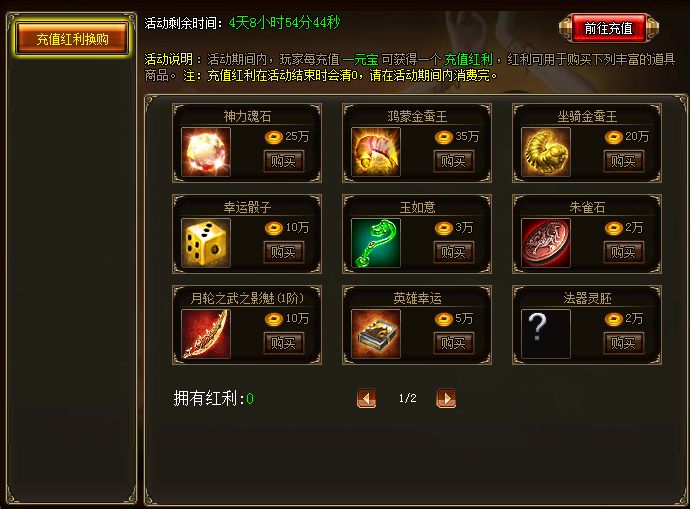 活动详情:活动期间,玩家每充值一元宝可获得一个充值红利,红利可用于购买活动中的丰富道具商品。注意:充值红利在活动结束后清零,请在活动期间内消费完哦。