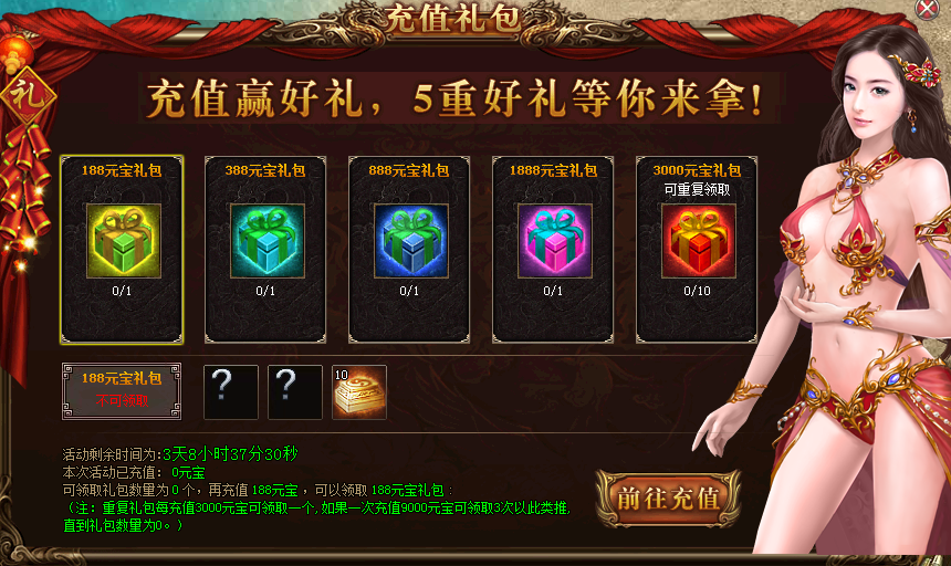 活动详情:活动期间充值达到指定元宝数,即可领取一份对应充值礼包,3000元宝礼包更可重复充值领取10次,每充值3000元宝可领取一个,直到礼包数为0为止。