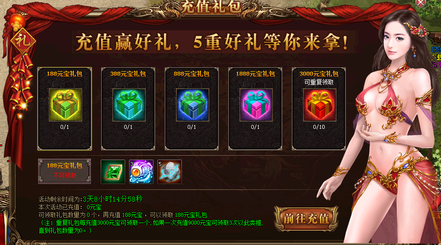 活动详情:活动期间充值达到指定元宝数,即可领取一份对应充值礼包,3000元宝礼包更可重复充值领取10次,每充值3000元宝可领取一个,直到礼包数为0为止。