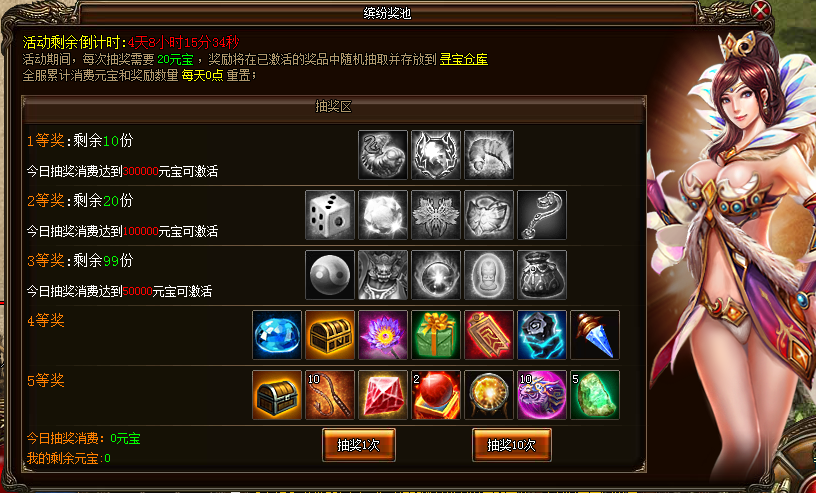 活动详情:活动期间,每次抽奖需要20元宝,奖励将在已激活的奖品中随机抽取并存放到寻宝仓库。全服累计消费元宝和奖励数量每天0点重置。
