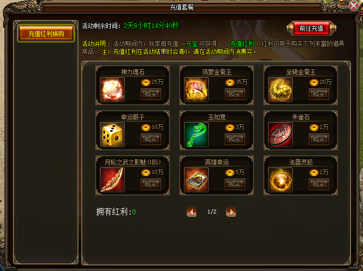 活动详情:活动期间,玩家每充值一元宝可获得一个充值红利,红利可用于购买活动中的丰富道具商品。注意:充值红利在活动结束后清零,请在活动期间内消费完哦。