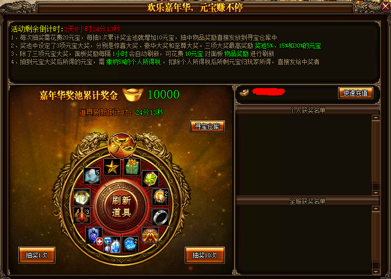 2、转盘面板奖励每隔1小时自动刷新,可花费10元宝对面板奖励快速进行刷新。