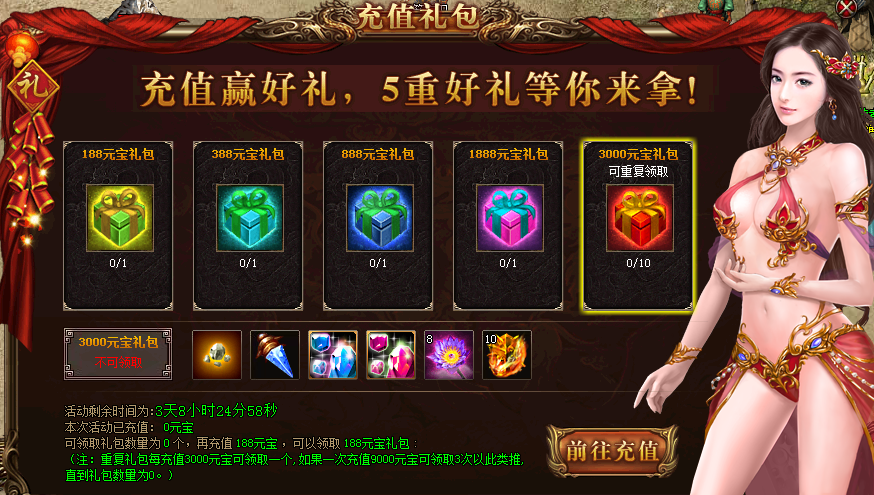 活动详情:活动期间充值达到指定元宝数,即可领取一份对应充值礼包,3000元宝礼包更可重复充值领取10次,每充值3000元宝可领取一个,直到礼包数为0为止。