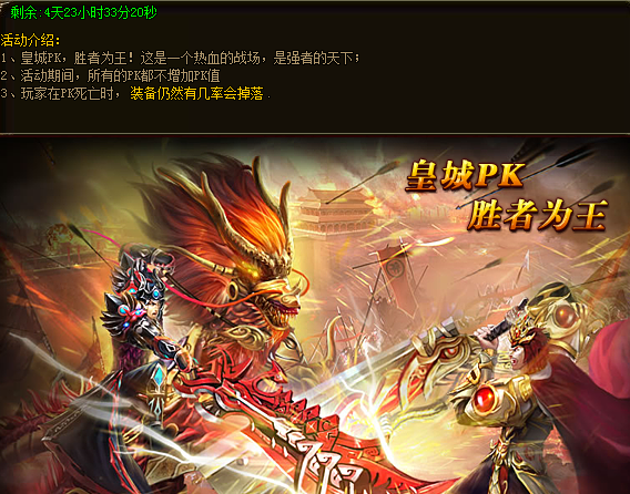 活动期间,除安全区外,任何地图进行PK击杀玩家都不增加PK值,但装备掉落几率仍然按照玩家当前PK值情况计算。