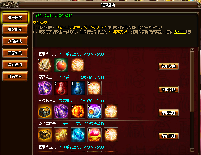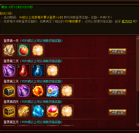 活动期间,60级以上玩家每天累计登录1小时即可领取奖励,奖励一共7天,随天数累计不间断,VIP玩家领取登录奖励时若满足相应的VIP等级要求则可以获得双倍物品奖励,活动期间领取奖励时VIP过期则对应天数奖励只能领取1倍,重新激活可重新领取双倍。