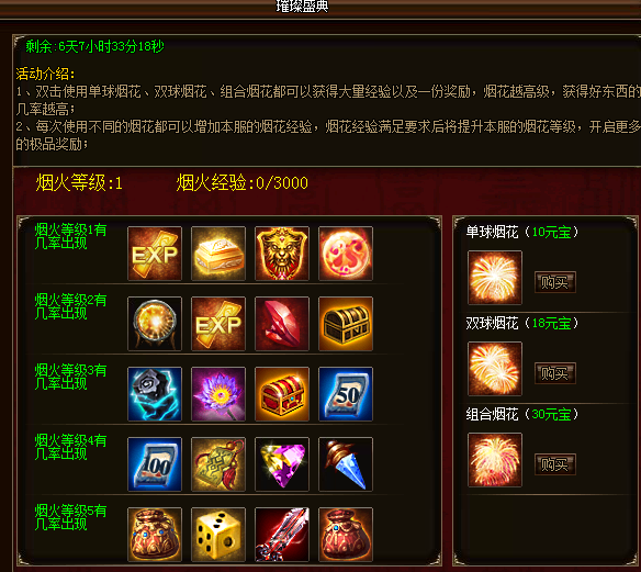 活动期间,玩家使用单球烟花、双球烟花、组合烟花可获得大量经验并获得一份物品奖励,同时会增加本服的烟火经验,烟火经验达到上限后会提升烟火等级,烟火等级提升后会激活对应的烟火奖励,使用烟火将会有几率获得对应奖励,烟火等级越高使用烟火获得珍贵道具奖励的几率越高,使用烟火获得的道具直接进入玩家背包。
