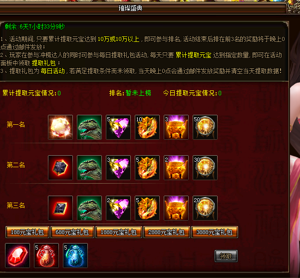 b) 活动期间,玩家每天累计提取元宝达到188、688、1888、2888、3888时即可在面板领取相应的每日充值礼包,礼包每日重置,当天没有领取的奖励第二天零点时以邮件补发。