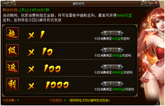 活动详情:玩家消费到制定金额,将可在面板中抽取返利,最高可获得9999元宝返利,返利将在次日以邮件形式发放。