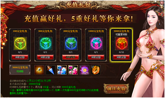 活动详情:活动期间充值达到指定元宝数,即可领取一份对应充值礼包,3000元宝礼包更可重复充值领取10次,每充值3000元宝可领取一个,直到礼包数为0为止。