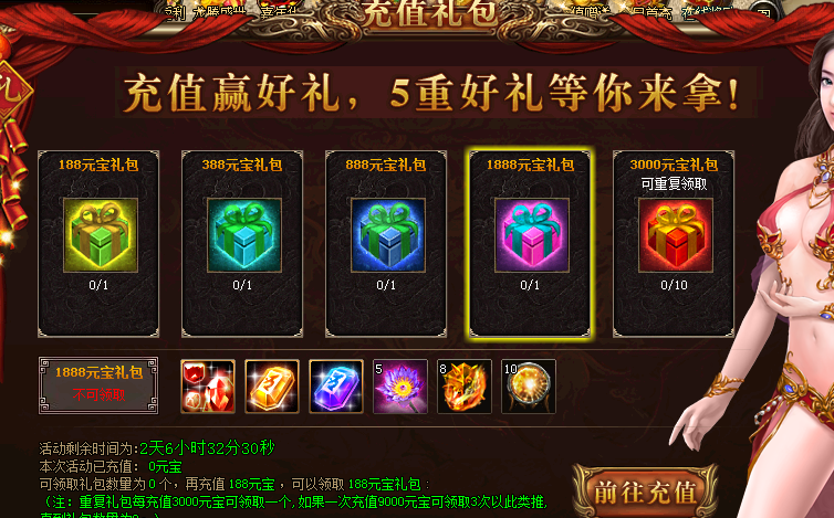活动详情:活动期间充值达到指定元宝数,即可领取一份对应充值礼包,3000元宝礼包更可重复充值领取10次,每充值3000元宝可领取一个,直到礼包数为0为止。