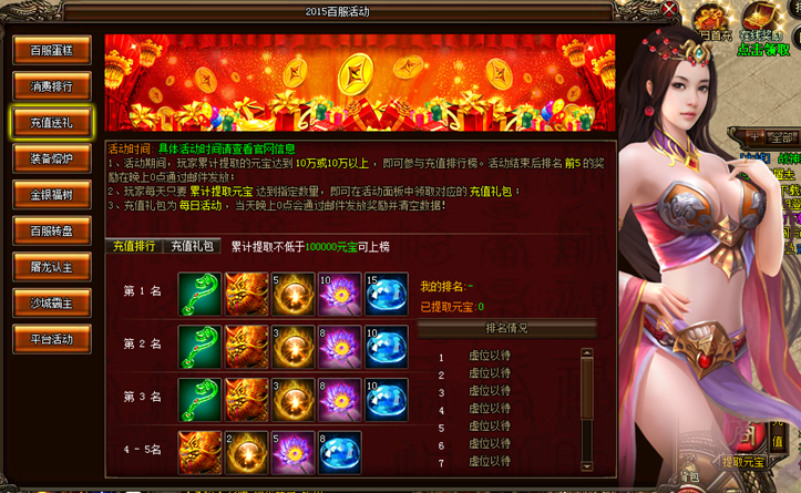 3、 活动期间,玩家累计充值满足100000元宝且本服排名前5的玩家,还可获得充值排行奖励,奖励将在活动结束后以邮件形式发送;