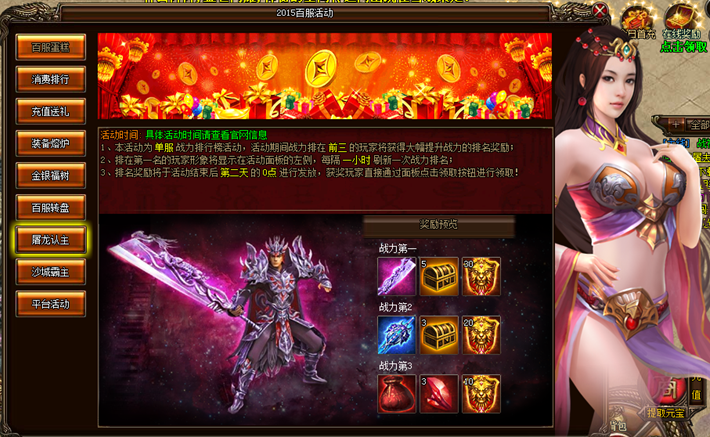 3、 战力排名第一的玩家可获得紫金屠龙*1,5级魂石包*5,兽灵*30;