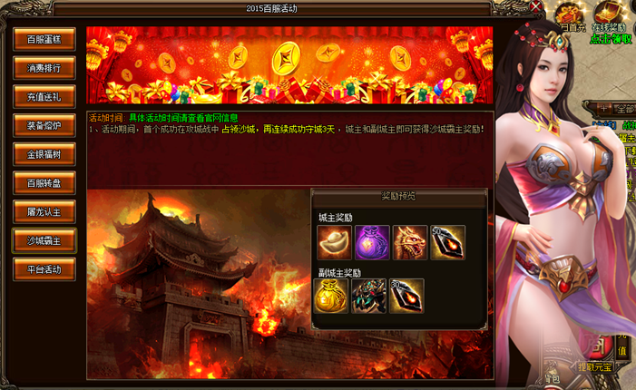3、 该服务器沙城城主可获得10000元宝,火龙华戒包*1,燃云龙御【30天】*1,焰光铁*50;