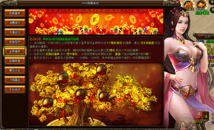 1、 活动期间,50级以上的玩家可在活动面板中培养和摘取金银福树的果实;