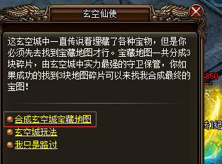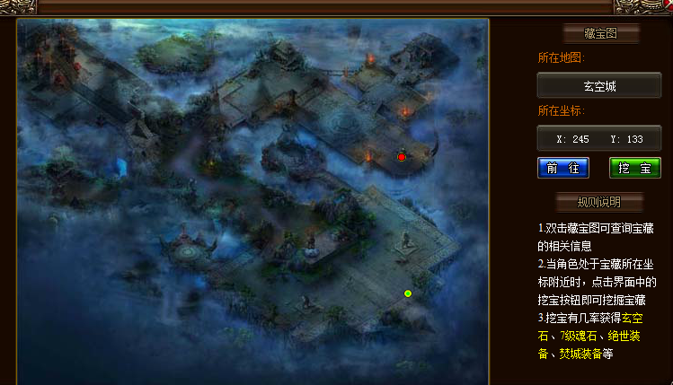 玄空城BOSS会分别产出玄空城宝藏地图上、中、下三个碎片,集齐后可在玄空城NPC玄空仙使那里合成玄空城宝藏地图,双击宝藏地图就能进行挖宝,宝藏地图可叠加,挖宝坐标会在下线后重置,玄空城挖宝必获得物品奖励,还有几率获得新装备升级道玄空石。