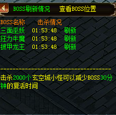 服务器开启或重启后刷新时间为3小时,被击杀后刷新时间分别为:三面巫妖24小时、狂力牛魔30小时、披甲龙王36小时。玩家击杀玄空城内小怪数量每达到2000时就会减少全部BOSS刷新时间30分钟。BOSS刷新情况可在游戏的BOSS刷新状态