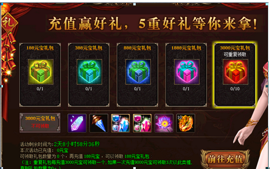活动详情:活动期间充值达到指定元宝数,即可领取一份对应充值礼包,3000元宝礼包更可重复充值领取10次,每充值3000元宝可领取一个,直到礼包数为0为止。