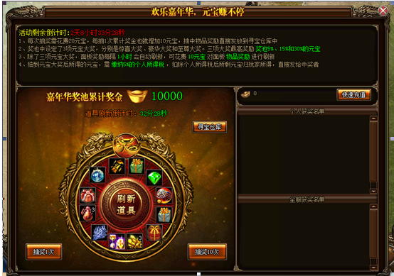 1、嘉年华转盘每次抽奖需花费20元宝,每抽1次累计奖池增加10元宝,奖池设有3项元宝大奖,分为惊喜大奖、豪华大奖、至尊大奖,奖励最高可获得5%、15%、30%的奖池元宝。抽中元宝需缴纳5%个人所得税。