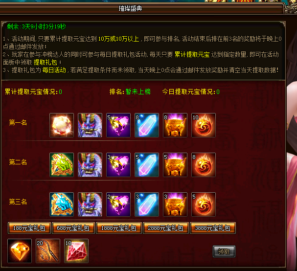 b) 活动期间,玩家每天累计提取元宝达到188、688、1888、2888、3888时即可在面板领取相应的每日充值礼包,礼包每日重置,当天没有领取的奖励第二天零点时以邮件补发。
